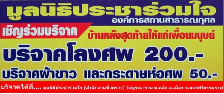1. บริจาคโดยตรงด้วยตัวเองที่ มูลนิธิประชาร่วมใจ องค์การสถานสาธารณกุศล(สำนักงานชั่วคราว) วัดบูรณาราม ถ.ราชดำเนิน ต.คลัง อ.เมือง จ.นครศรีธรรมราช 80000 โทรศัพท์. 075-345599